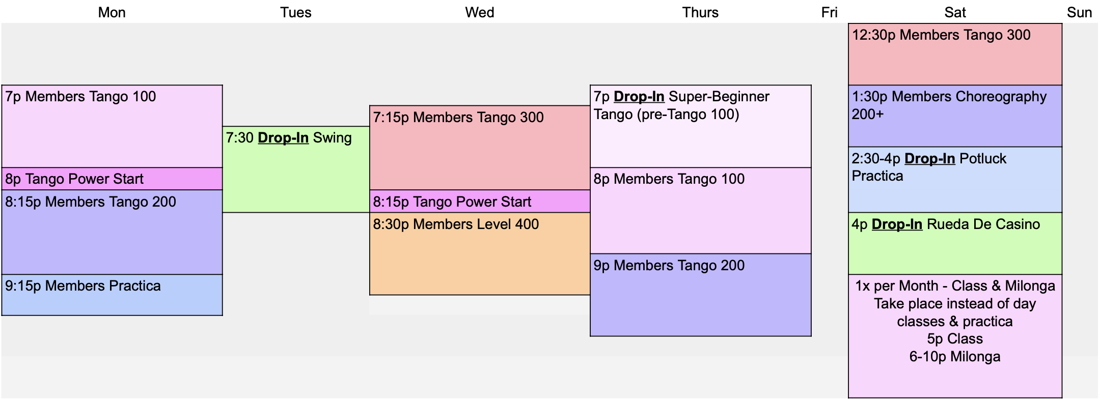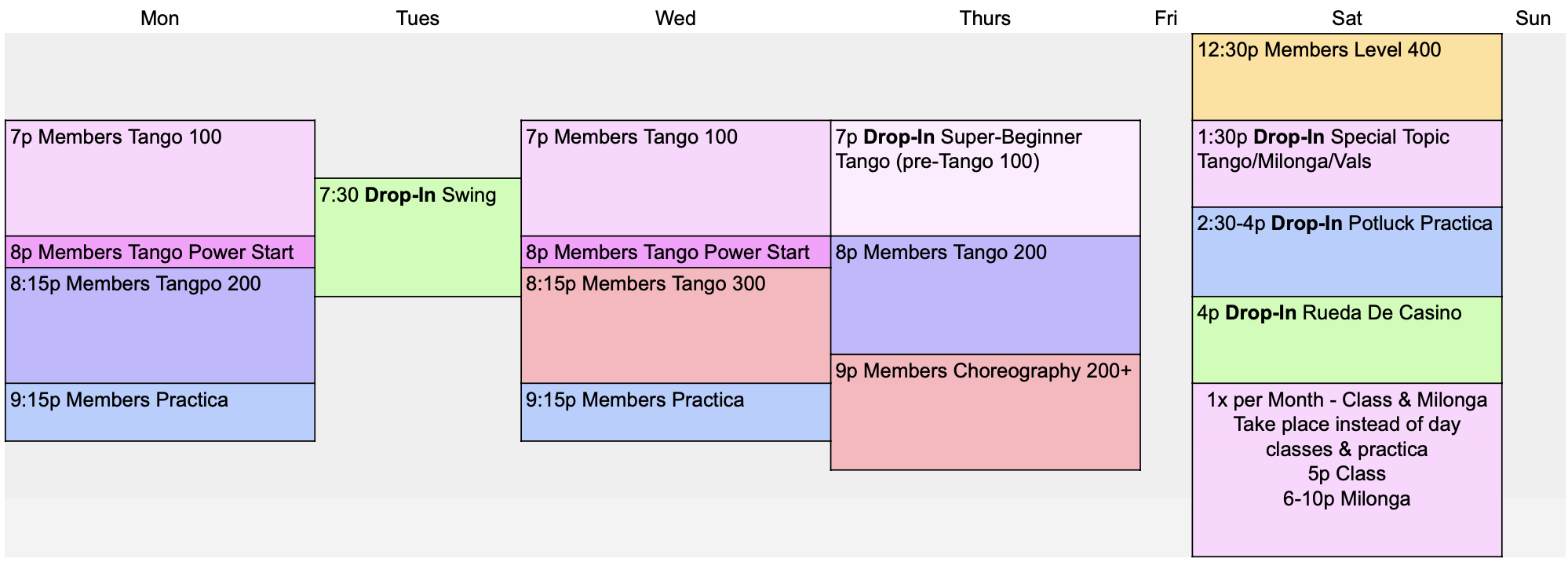 Remember, if you have a Level 100 Membership, all Drop-In tango classes are covered and you won’t be charged again for booking! If you have a Founders or Complete Membership, you get all the drop-in classes as well as the swing and salsa classes! Even though this schedule shows the Drop-In price, you won’t be charged when you click “Book!”